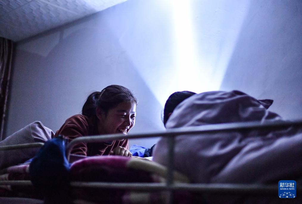 斯曲卓瑪(左)和舍友“夜談”(11月9日攝)。新華社記者 晉美多吉 攝