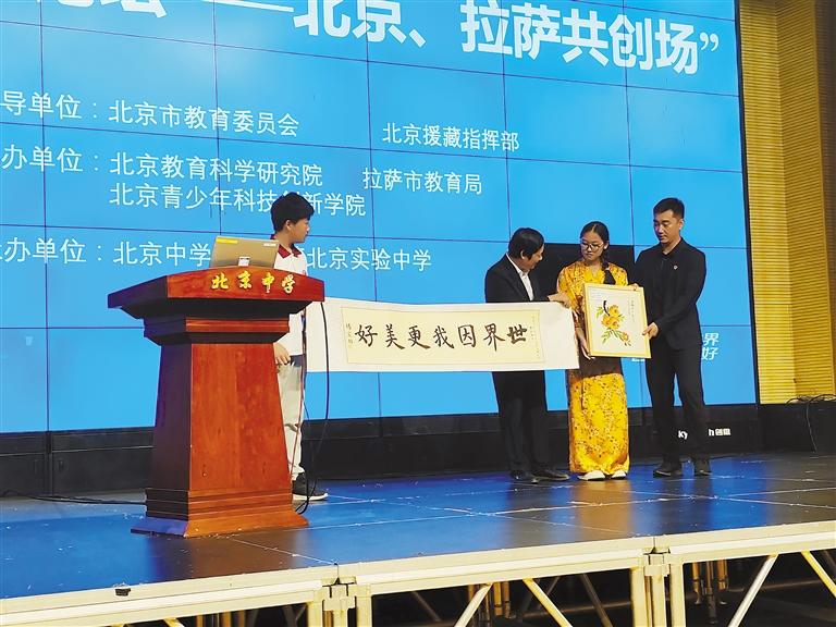 圖為拉薩北京實驗中學(xué)學(xué)生向友好學(xué)校贈送禮物。