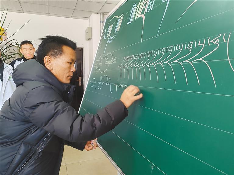 圖為洛桑多吉老師為學(xué)生們傳授藏文書法知識。