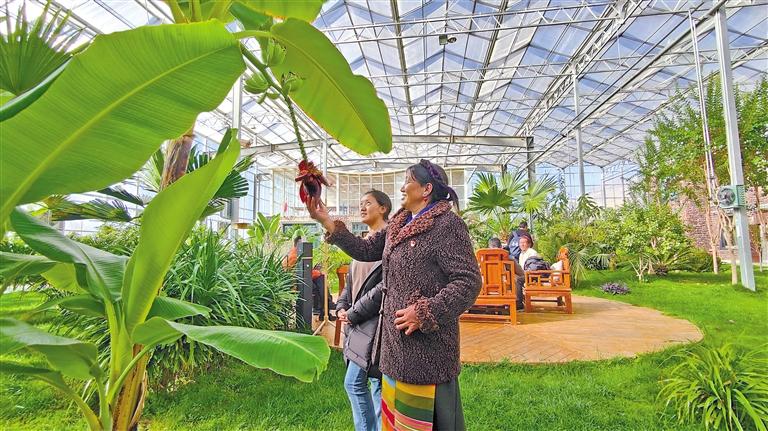 隆冬時(shí)節(jié),山南市扎囊縣阿扎鄉(xiāng)的南方植物展示館內(nèi),一派郁郁蔥蔥的景象。椰子樹、鶴望蘭、凌霄花相映成趣。該館是藏草萬(wàn)畝植物種苗繁育基地的一部分,可為參觀游客提供林草科普知識(shí)講解,為學(xué)生開設(shè)生態(tài)課堂進(jìn)行研學(xué)實(shí)踐等。