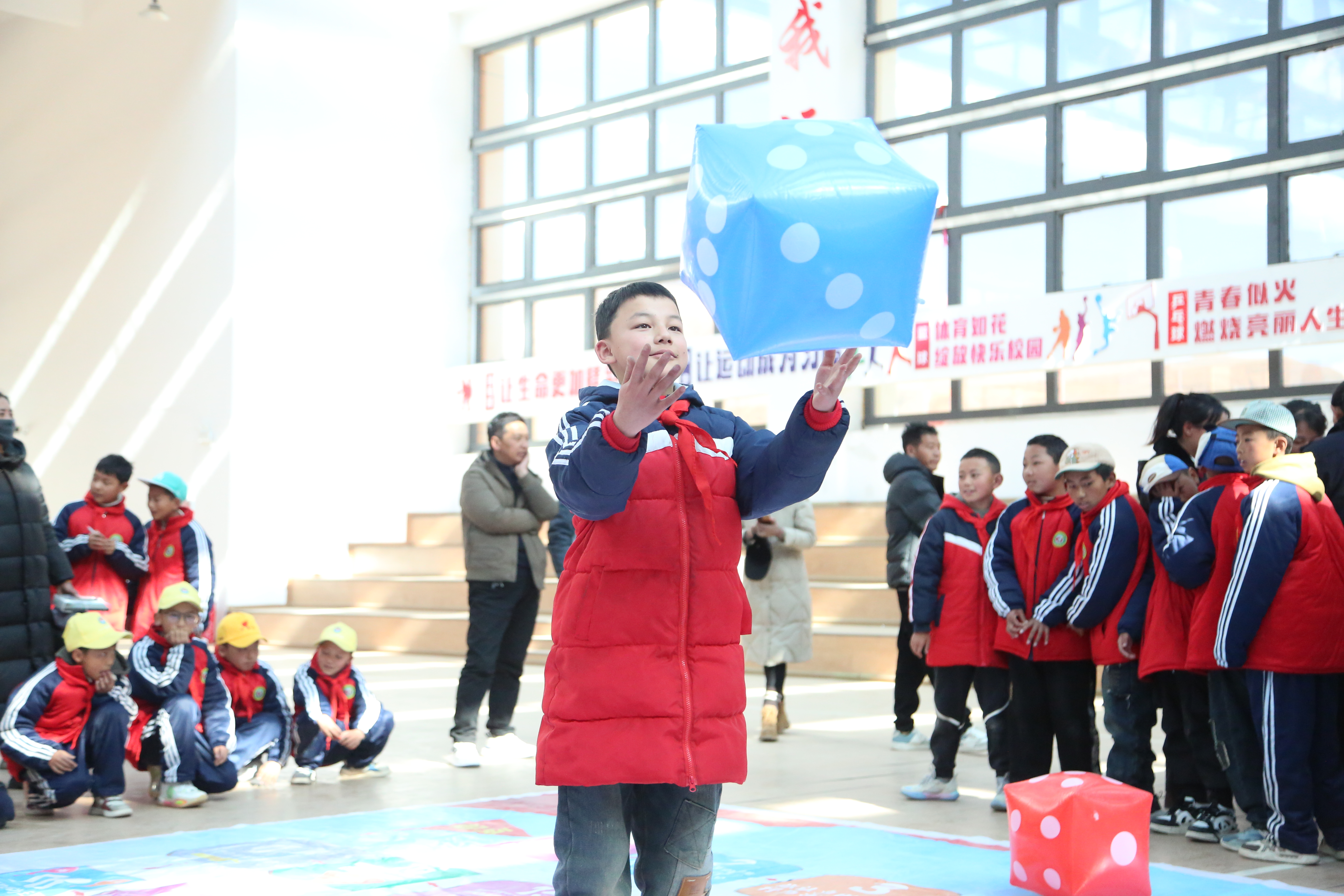 活動(dòng)現(xiàn)場(chǎng)引入比賽機(jī)制,100多名學(xué)生歡聚在操場(chǎng)上玩起占地6米乘6米的超大棋盤(pán)。擲骰子、跳格、快速回答法律問(wèn)題、完成相應(yīng)任務(wù)、領(lǐng)取獎(jiǎng)勵(lì)......場(chǎng)上歡聲不斷,場(chǎng)外躍躍欲試?!斑@個(gè)‘法治飛行棋’真好玩,玩游戲的同時(shí)還能學(xué)習(xí)法律知識(shí),比坐在教室里聽(tīng)講好多了,還獲得了好多小禮品?!蔽迥昙?jí)2班的珠薩同學(xué)高興地告訴記者。