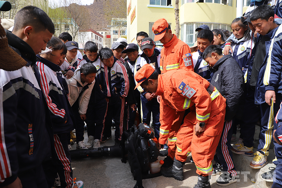 “這是風(fēng)力滅火機(jī),此款型號(hào)的風(fēng)力滅火機(jī)最高風(fēng)速最高可以達(dá)到90m/s,遇見草原火時(shí),我們就用它來進(jìn)行滅火?!毕绬T背起風(fēng)力滅火機(jī),將裝備點(diǎn)火后對(duì)準(zhǔn)預(yù)設(shè)物進(jìn)行示范操作。在現(xiàn)場互動(dòng)中,部分師生代表當(dāng)起“消防員”體驗(yàn)設(shè)備操作。除了現(xiàn)場互動(dòng)環(huán)節(jié),左貢縣消防人員還仔細(xì)檢查了學(xué)校的消防設(shè)施配置,并指導(dǎo)學(xué)校如何定期進(jìn)行消防自檢。