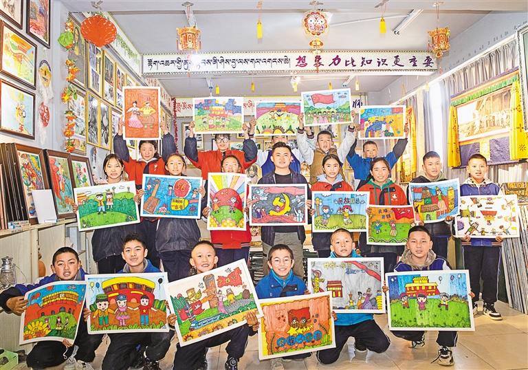 圖為桑日縣中學美術(shù)興趣社團的孩子們展示以“鑄牢中華民族共同體意識”為主題的繪畫作品。 次仁龍布 記者 洛桑 攝