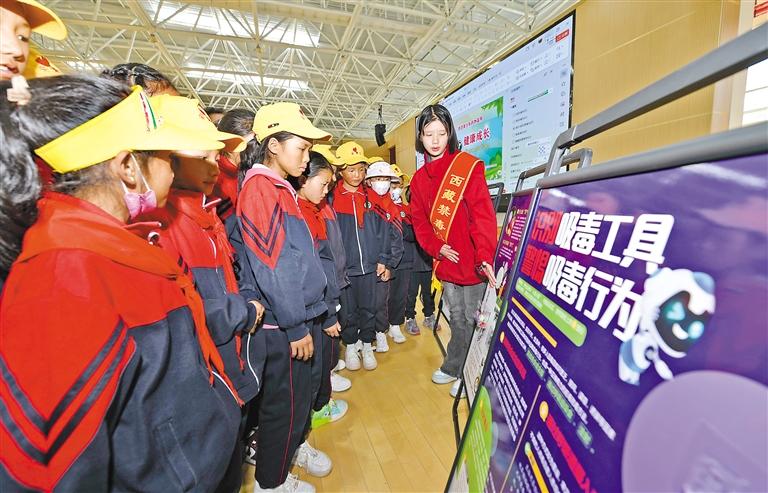 志愿者為拉薩市尼木縣小學師生講解禁毒知識。記者 唐斌 攝