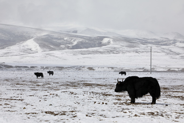 時(shí)已暮春,但在高寒牧區(qū)天然草場,草還沒發(fā)芽,洛絨赤乃只好讓牛在雪地里啃冬天留下的枯草。雖然定居點(diǎn)牛棚里有儲(chǔ)存的人工飼草,但還是要備不時(shí)之需,因?yàn)榇合闹贿€會(huì)經(jīng)常下雪,也是牦牛最難熬的時(shí)節(jié)。