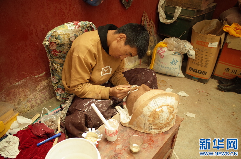在西藏拉薩市達孜區(qū),西洛的學(xué)徒旦增扎西在給面具塑形(5月15日攝)。新華社記者 格桑邊覺 攝