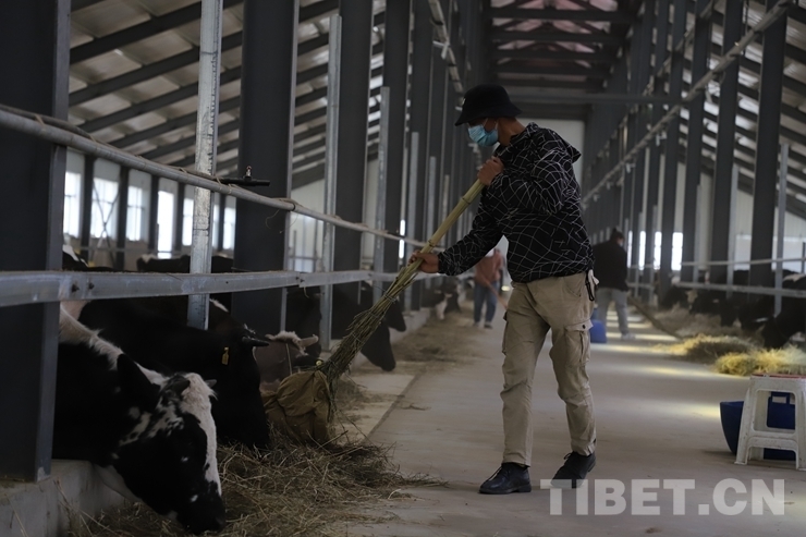 圖為旦增達(dá)瓦在奶牛養(yǎng)殖基地工作 攝影:趙耀