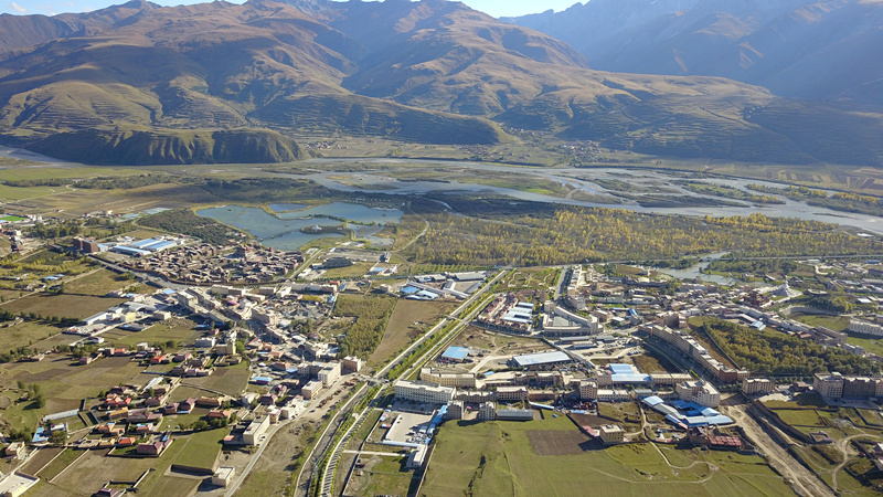 在甘孜州甘孜縣吉絨隆溝易地扶貧安置點,旁邊的十八軍窯洞遺址群展現(xiàn)著這里的紅色血脈。遠處雪山座座相連,不遠處縣城邊雅礱江河谷地帶,景色醉人。