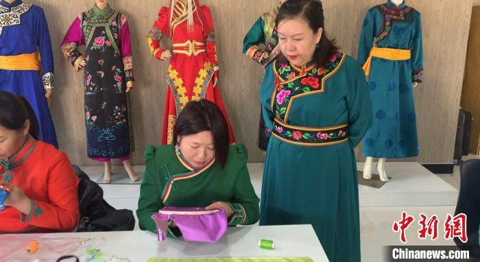 田斯琴高娃是內(nèi)蒙古自治區(qū)非物質(zhì)文化遺產(chǎn)項(xiàng)目科爾沁服飾代表性傳承人,始終致力于將文化傳承與脫貧致富結(jié)合,3000多位草原姐妹因?yàn)樗龕?ài)上了蒙繡。這些年,她教授婦女們蒙繡技藝,回收她們的作品。2018年,田斯琴高娃創(chuàng)辦了科爾沁民族服飾研究所,2020年創(chuàng)辦培訓(xùn)學(xué)校。
