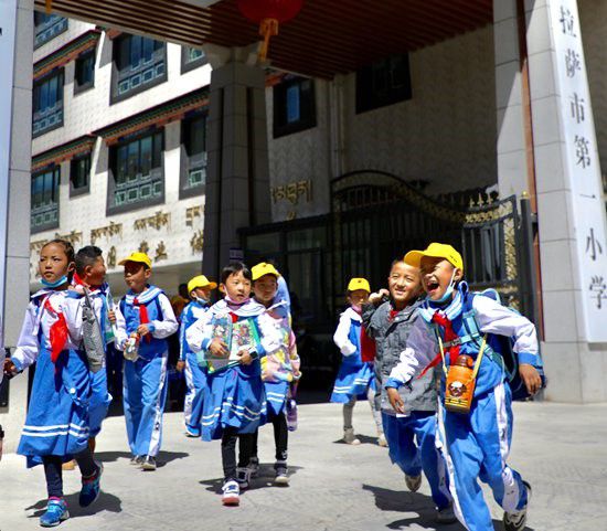 拉薩市第一小學(xué)的學(xué)生們放學(xué)后歡快地走出校門。次仁羅布 攝