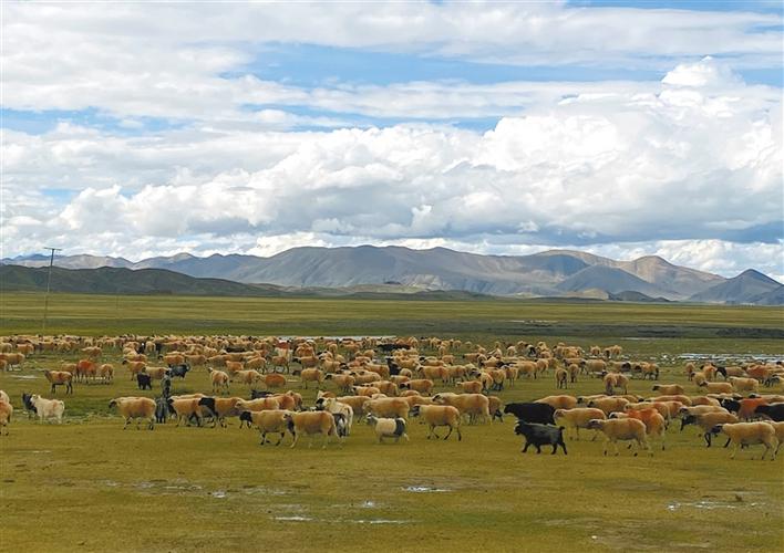 圖為浪卡子縣羊卓草原上,羊群在悠閑地吃草。記者 洛桑 攝