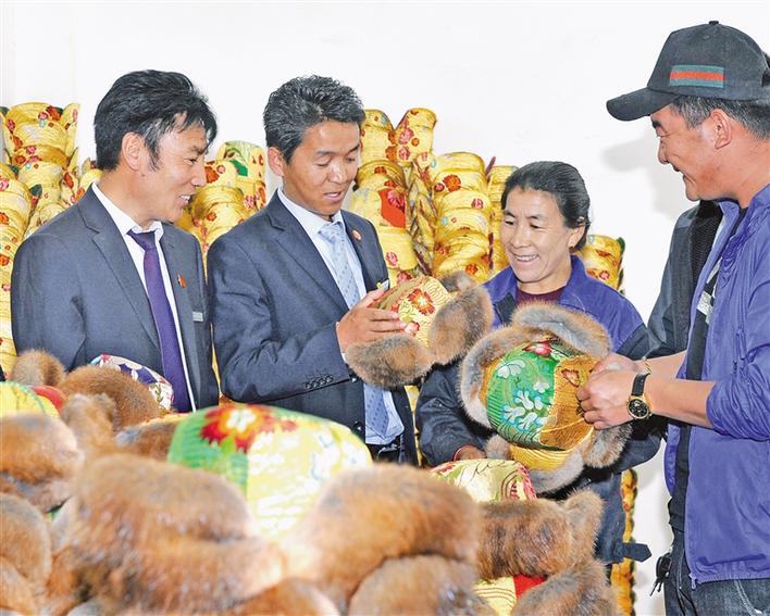 農(nóng)行山南扎囊縣支行客戶經(jīng)理(左二)來到扎囊縣扎塘鎮(zhèn)羊嘎村藏式帽子次仁金果農(nóng)民專業(yè)合作社對(duì)接產(chǎn)業(yè)扶貧項(xiàng)目。
