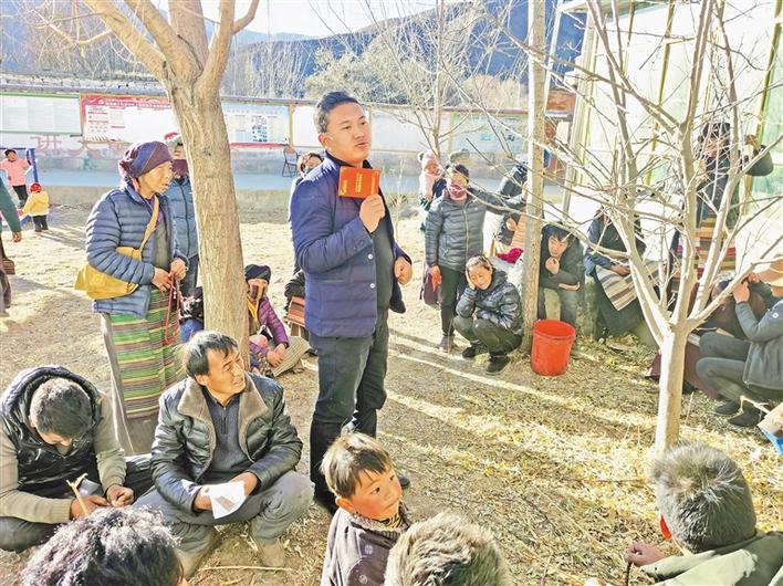 農(nóng)行山南扎囊縣吉汝?duì)I業(yè)所客戶經(jīng)理(前排站立者)在德吉林村講解精準(zhǔn)扶貧政策。