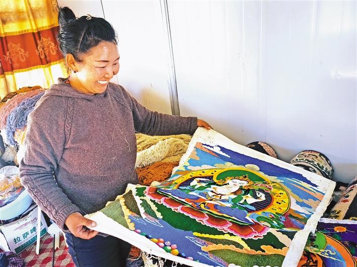 西藏日喀則市易地扶貧搬遷點(diǎn)群眾展示自己的藏繡作品。[詳細(xì)]