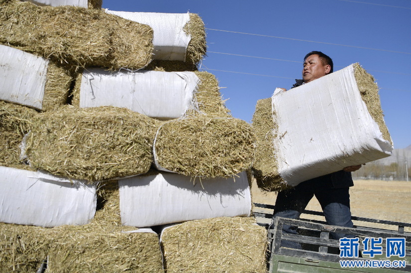 西藏山南市貢嘎縣吉雄鎮(zhèn)紅星社區(qū)致富帶頭人、奶牛養(yǎng)殖基地負責人邊巴碼放冬儲飼草(11月25日攝)。新華社記者 張汝鋒 攝