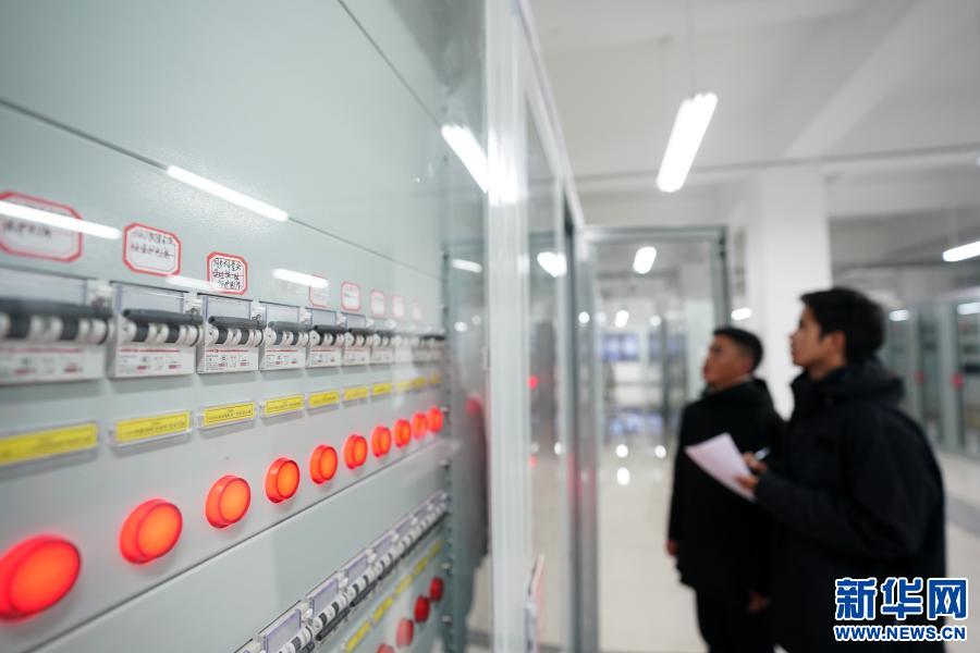 在西藏阿里與藏中電網聯(lián)網工程薩嘎220千伏變電站,工作人員查看設備運行情況(2020年11月27日攝)。新華社記者 詹彥 攝