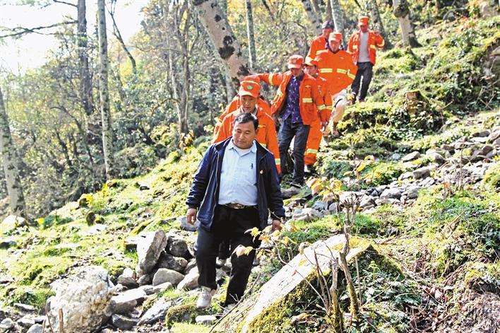 增巴帶領(lǐng)森林巡邏隊(duì)在林區(qū)巡山。記者 張斌 陳林 攝