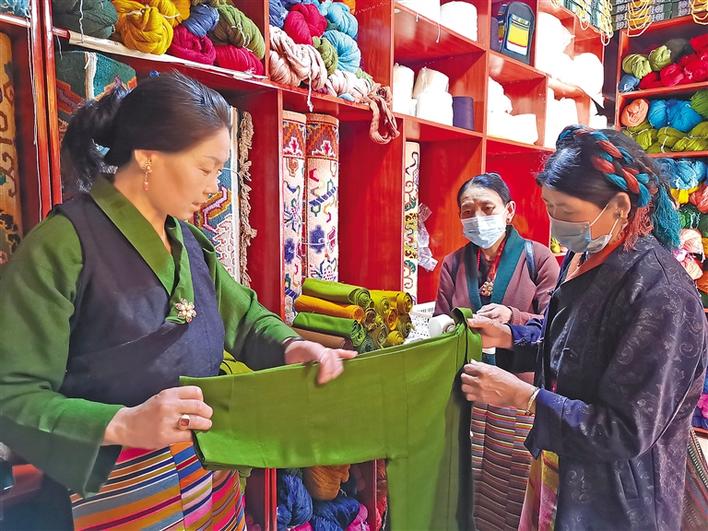 日喀則市仁布縣德吉林鎮(zhèn)德旦康薩傳統(tǒng)手工業(yè)農(nóng)牧民專業(yè)合作社負責(zé)人旦真愛人(左一)正在向顧客展示產(chǎn)品。記者 扎西頓珠 攝
