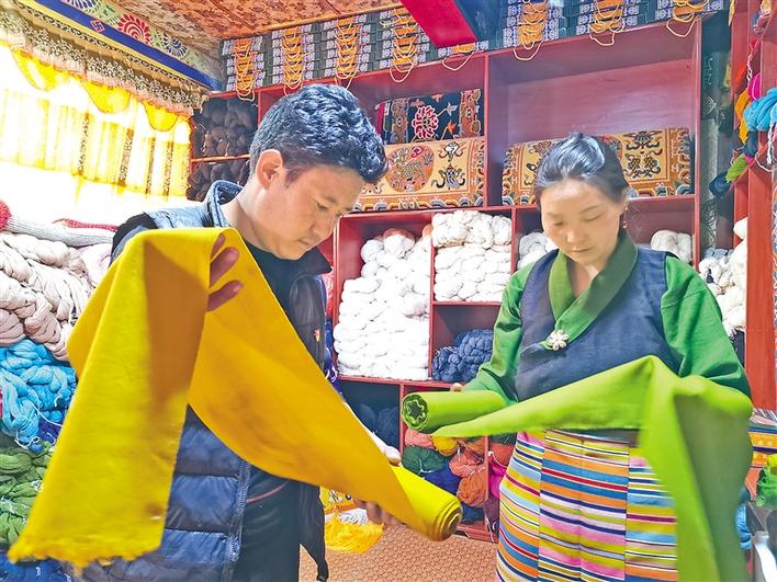 日喀則市仁布縣德吉林鎮(zhèn)德旦康薩傳統(tǒng)手工業(yè)農(nóng)牧民專業(yè)合作社負責(zé)人旦真正在查看產(chǎn)品質(zhì)量。記者 扎西頓珠 攝