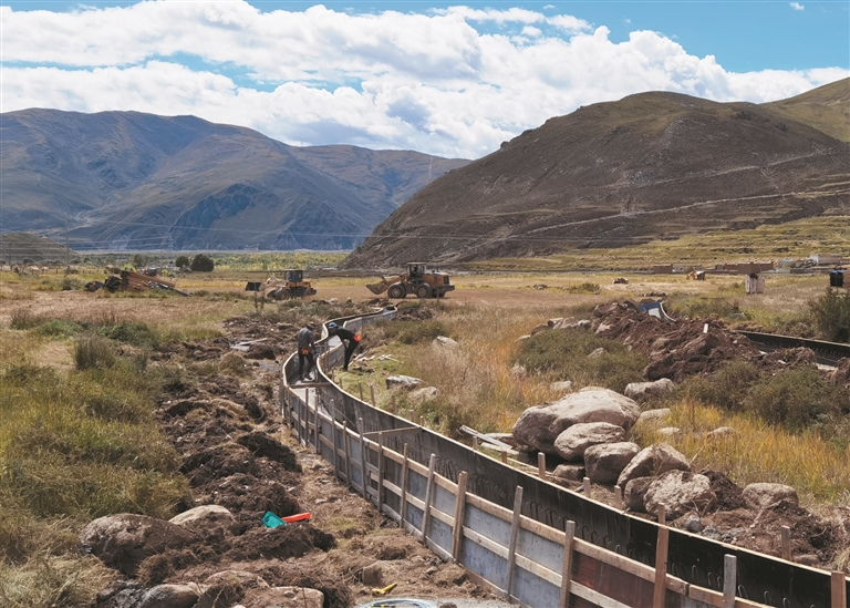 圖為當(dāng)?shù)剞r(nóng)牧民正在參與修建灌溉水渠。拉薩融媒記者 凃 瓊攝