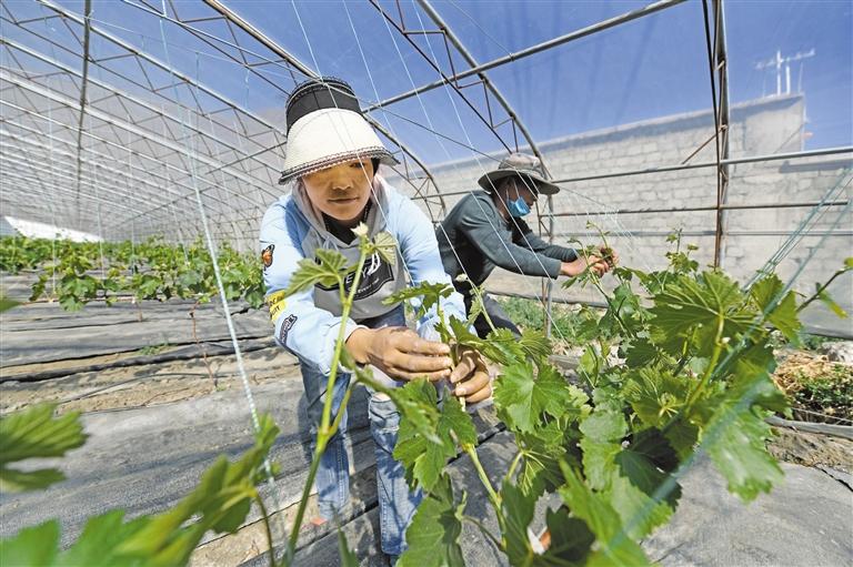 圖為乃東區(qū)頗章鄉(xiāng)村民在哈魯崗百畝農業(yè)產園內的葡萄園里剪枝。 記者 楊小娟 攝