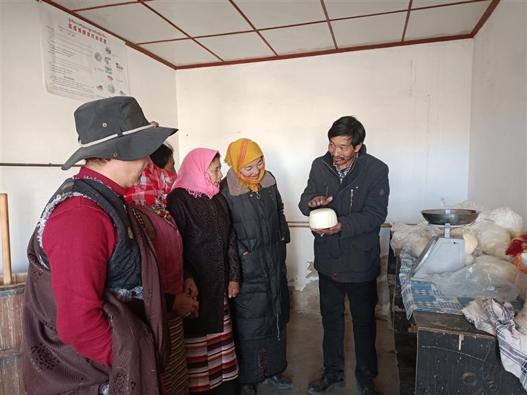 圖為旦巴念扎在指導(dǎo)合作社投工投勞人員制作奶制品。記者 張宇 攝