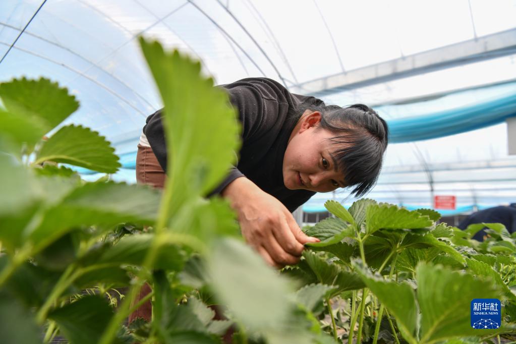南伊村村民亞夏在采摘草莓(4月12日攝)。新華社記者 晉美多吉 攝