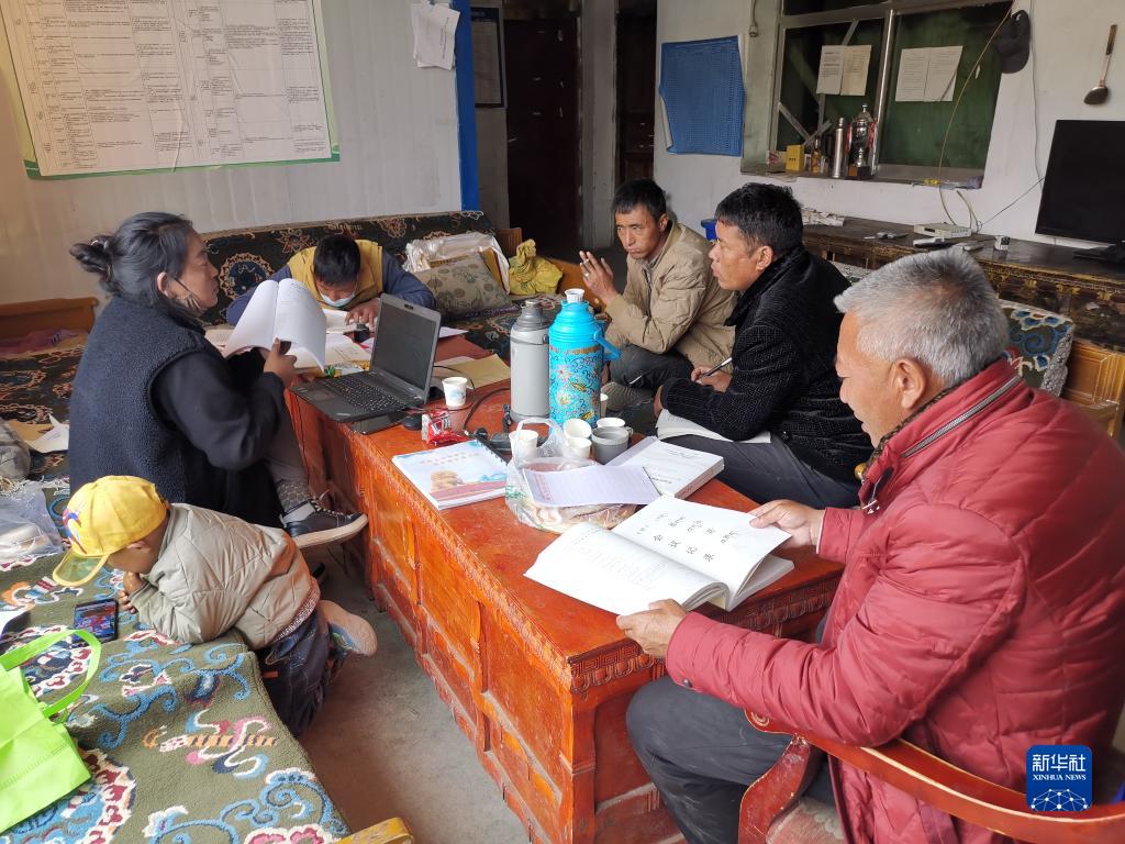 在特布拉村,駐村第一書記吉宗(女,左一)正與其他村干部開會,商討農村廁所改造事宜。新華社記者 林建楊 攝(手機照片,4月16日攝)