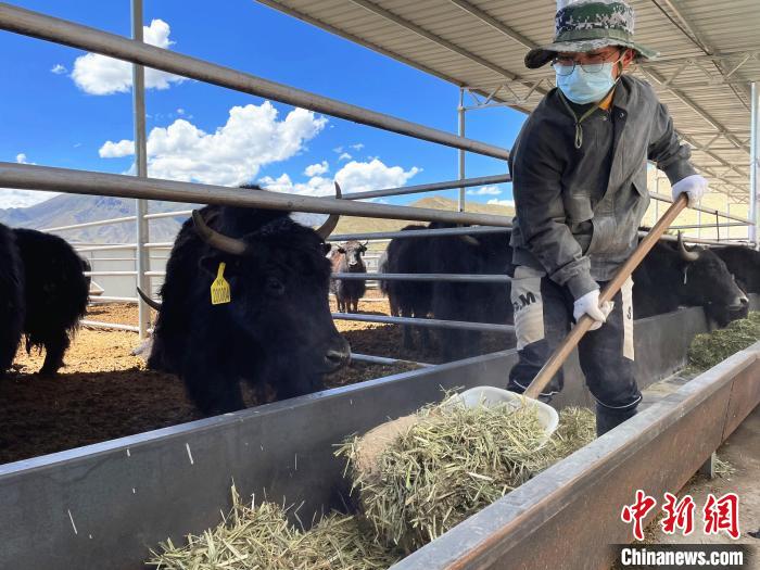 圖為拉薩市林周縣格桑塘現(xiàn)代農(nóng)牧業(yè)產(chǎn)業(yè)示范園內(nèi),工作人員為牦牛準備飼料?!∪轿木?攝