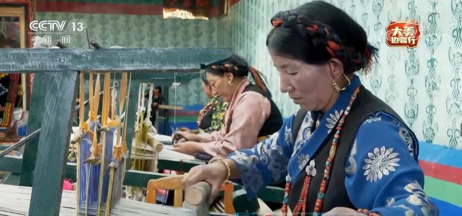 崗巴縣崗姆沖農(nóng)民專業(yè)合作社負(fù)責(zé)人 央拉姆:我們這里有卡墊、靠背、氆氌、邦典。這個叫邦典,我們就這樣戴的。