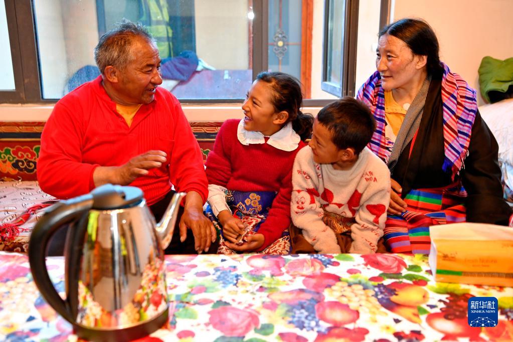從雙湖縣多瑪鄉(xiāng)搬遷到森布日安置點新居的牧民索朗措加(左一)和妻子查格(右一),與孫女旦珍卓嘎(左二)和孫子歸桑桑旦一起聊天(7月19日攝)。新華社記者 張汝鋒 攝