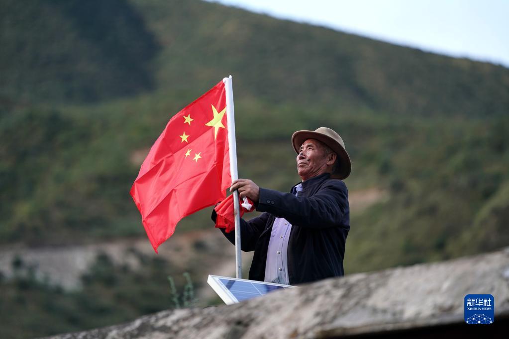 昌都市江達(dá)縣崗?fù)写宕迕衿瞻驮谖蓓敁Q上嶄新的國(guó)旗(2020年9月25日攝)。新華社記者 詹彥 攝