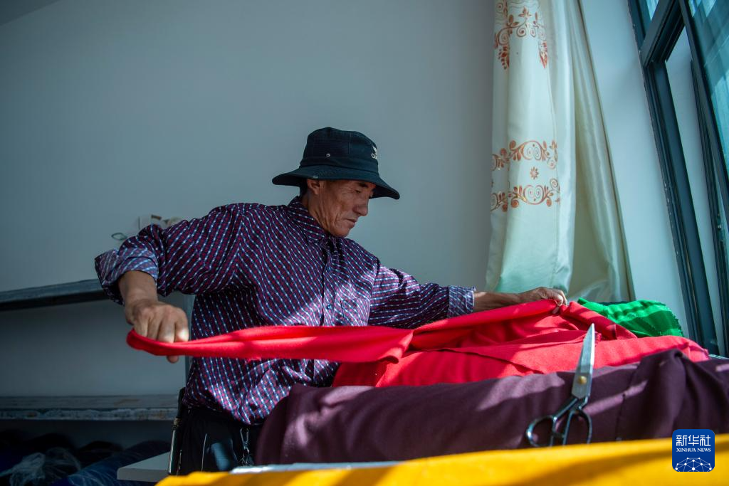 一位村民在裁剪布料(8月24日攝)。新華社發(fā)(旦增努布 攝)