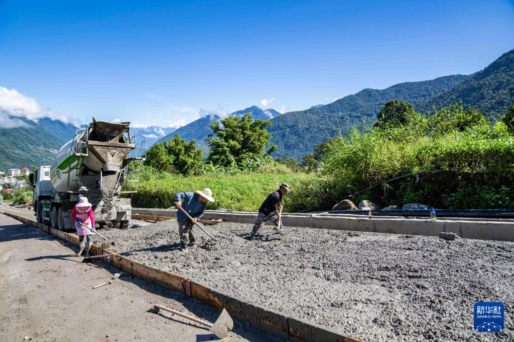 工人們?cè)谀摽h修筑鄉(xiāng)村公路(2023年10月13日攝)。新華社記者 孫非 攝
