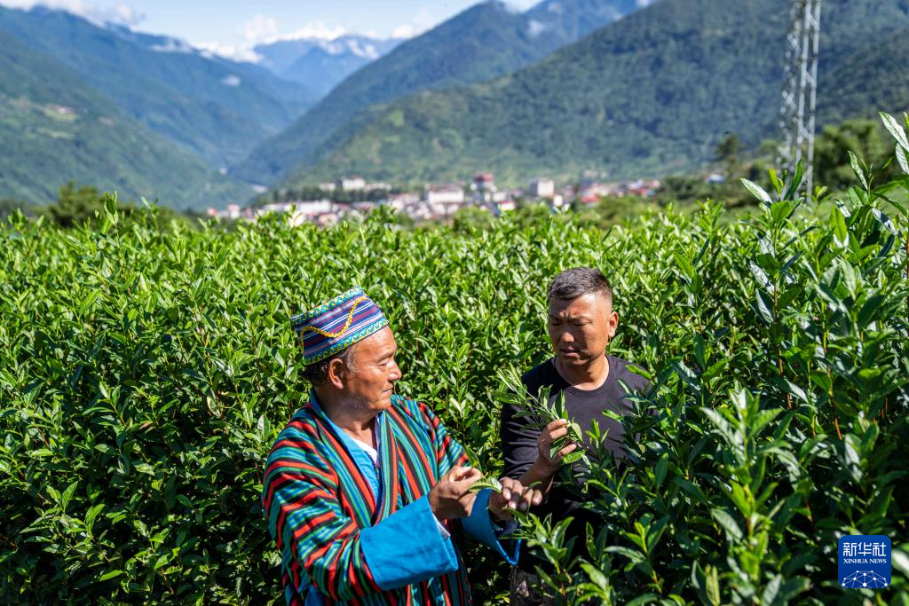 墨脫村村委會(huì)副主任達(dá)瓦次仁(右)查看茶葉生長(zhǎng)情況(2023年10月13日攝)。新華社記者 孫非 攝