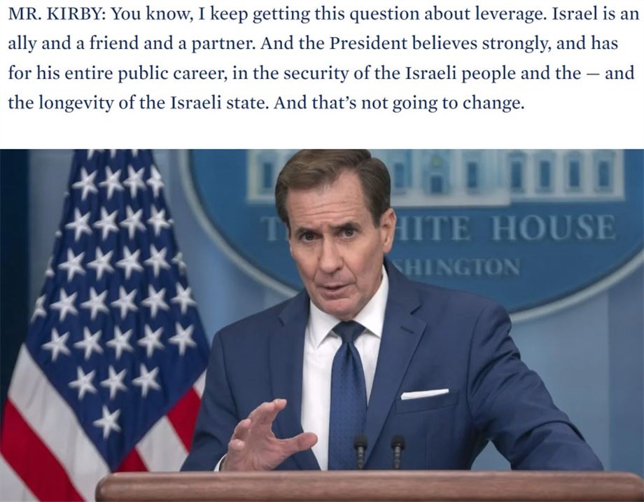 白宮國家安全委員會戰(zhàn)略溝通協(xié)調(diào)員柯比當(dāng)天在記者會上被反復(fù)追問“美國是否會切斷對以色列的武器供應(yīng)”時(shí)一味回避躲閃,但在回答美以關(guān)系問題時(shí)卻斬釘截鐵。