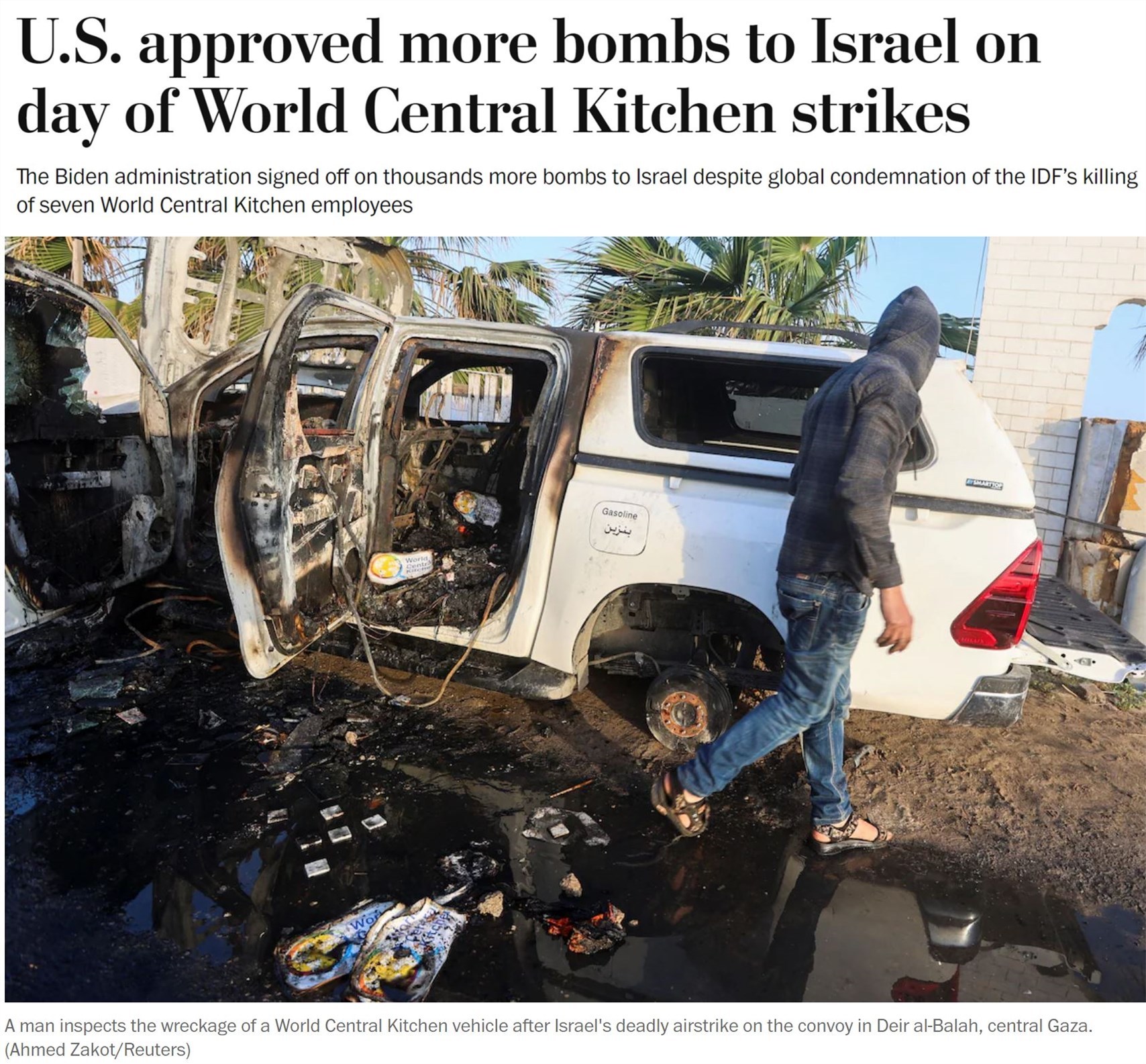據(jù)美媒報(bào)道,就在以軍襲擊國際慈善組織的同一天,美國批準(zhǔn)再向以色列提供數(shù)千枚炸彈。