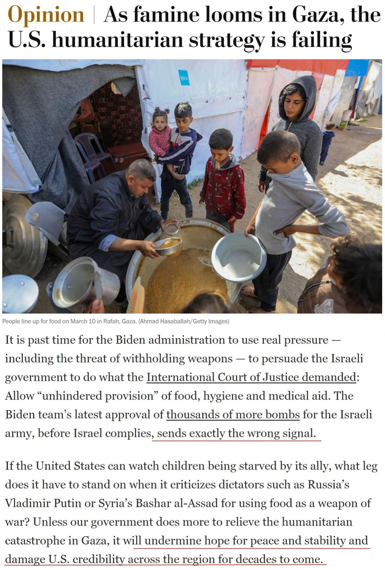 文章認(rèn)為,拜登政府早就應(yīng)該利用真正的壓力——包括威脅中斷武器供應(yīng)——來迫使以色列政府允許外界向加沙“不受阻礙地提供”食品和醫(yī)療援助。但相反,拜登團(tuán)隊(duì)最近卻批準(zhǔn)再向以軍提供數(shù)千枚炸彈,“這發(fā)出了完全錯(cuò)誤的信號”。