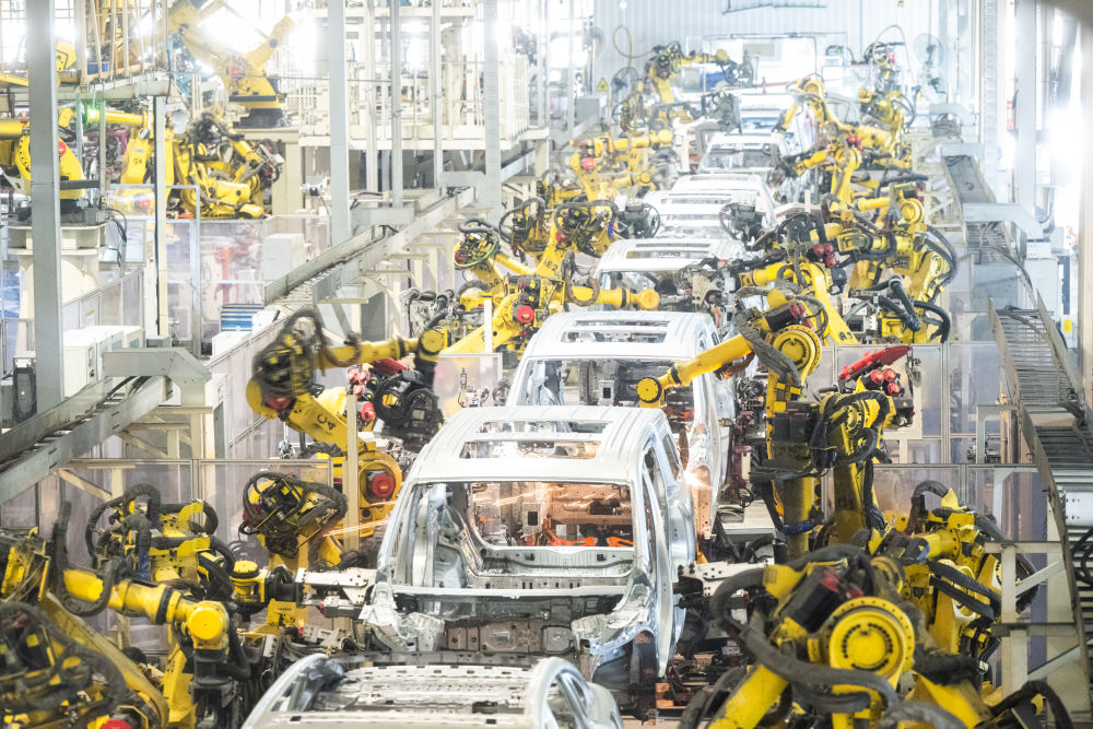 4月1日,在位于湖北武漢經(jīng)開區(qū)的嵐圖汽車電動化焊裝車間,機器人在流水線上作業(yè)。新華社記者肖藝九攝