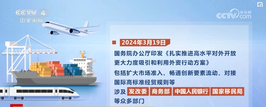 2024年3月19日,國務(wù)院辦公廳印發(fā)《扎實推進高水平對外開放 更大力度吸引和利用外資行動方案》,包括擴大市場準(zhǔn)入、暢通創(chuàng)新要素流動、對接國際高標(biāo)準(zhǔn)經(jīng)貿(mào)規(guī)則等,涉及國家發(fā)展改革委、商務(wù)部、中國人民銀行、國家移民局等眾多部門。