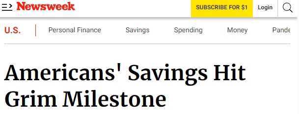 美國富國銀行(Wells Fargo)分享給《新聞周刊》(Newsweek)的一份分析報告顯示,美國人的儲蓄速度正在下降,達到一年多來的最低水平。與此同時,另一項調(diào)查指出,近38%的美國人不得不動用儲蓄或求助家人朋友以應(yīng)對日常支出。有超過半數(shù)的美國人認為通脹是美國當(dāng)前面臨的一個比移民和犯罪等更大的問題。