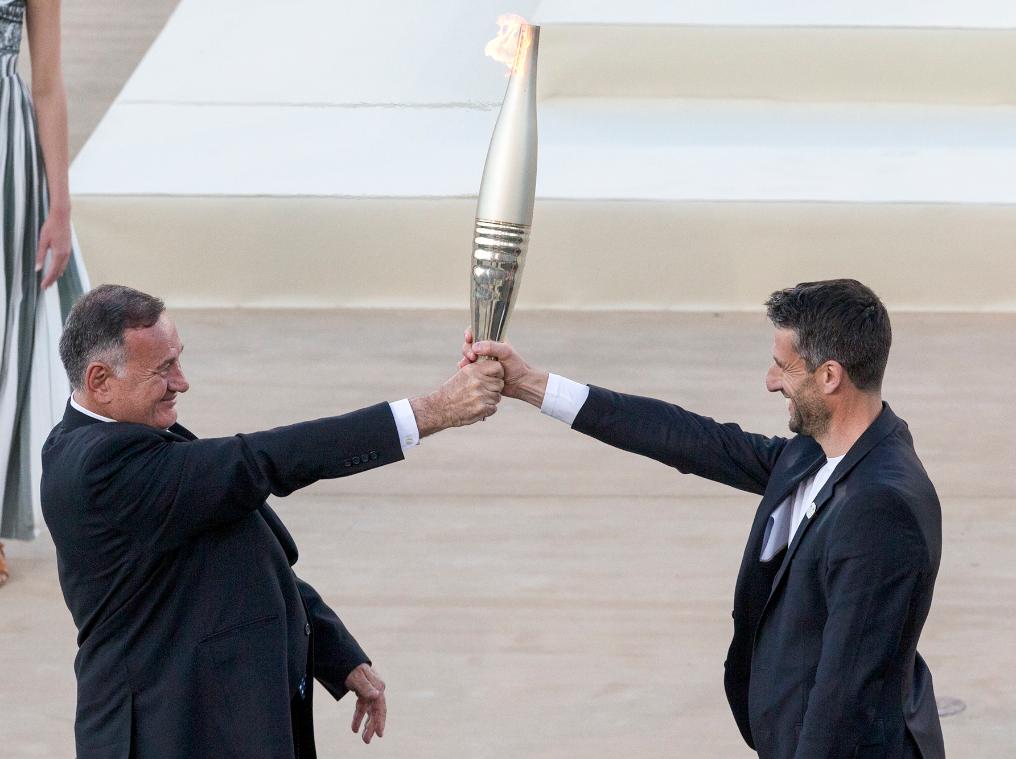 4月26日,希臘奧委會主席卡普拉洛斯(左)將火炬交給巴黎奧組委主席埃斯坦蓋。新華社發(fā)(馬里奧斯·羅洛斯攝)