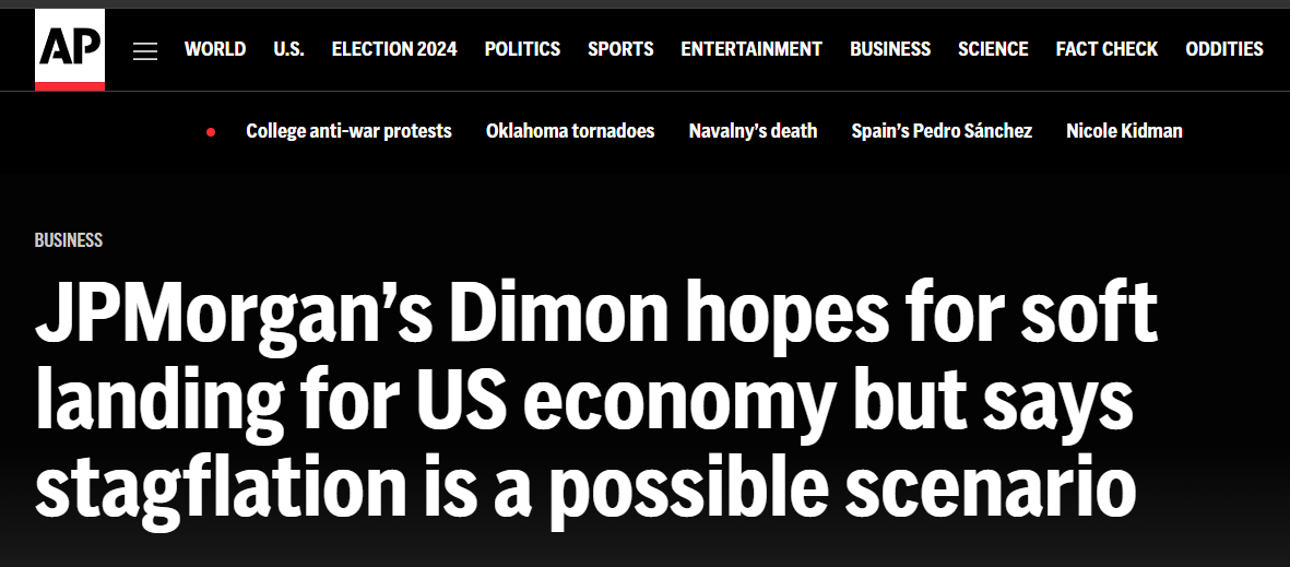 近日,摩根大通公司首席執(zhí)行官杰米·戴蒙在接受美聯(lián)社采訪時(shí)稱(chēng),他對(duì)美國(guó)經(jīng)濟(jì)仍保持“審慎”,并表示通脹可能會(huì)在更長(zhǎng)時(shí)間內(nèi)變得更棘手,“滯脹也可能是(美國(guó)經(jīng)濟(jì)面臨的)一種情況”。