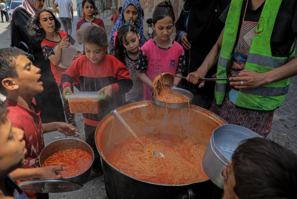 4月28日,在加沙地帶南部城市拉法,巴勒斯坦兒童領取食物。新華社發(fā) 里澤克·阿卜杜勒賈瓦德 攝