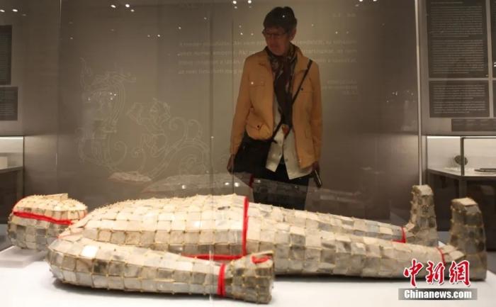 在匈牙利古都塞克什白堡舉行的“不朽的玉甲—中國(guó)漢代文物精品展”,共展出百余件玉器、漆器、陶器、青銅器、印章、石刻、錢幣等漢代文物,將漢代政治經(jīng)濟(jì)、社會(huì)生活、文化藝術(shù)和禮儀信仰逐一呈現(xiàn)。圖為當(dāng)?shù)貢r(shí)間5月7日,一名觀眾駐足細(xì)觀徐州博物館鎮(zhèn)館之寶西漢金縷玉衣。中新社記者 德永健 攝