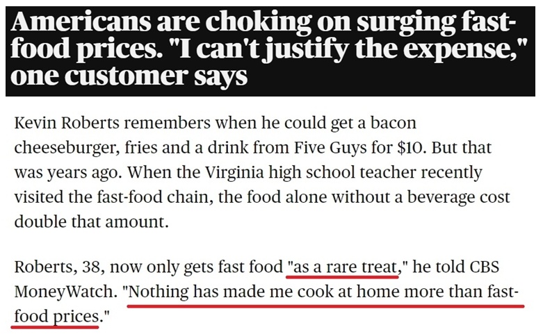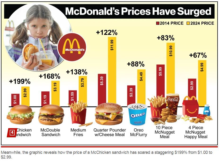 而如今,當(dāng)他再走進(jìn)這家快餐連鎖店時,單是漢堡加薯條(不含飲料)的價格就比之前的“三件套”翻了一番。