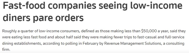 咨詢公司“收入管理解決方案”此前發(fā)布的一項民調(diào)結(jié)果顯示,年收入在5萬美元以下的美國人中,約有四分之一的人減少了快餐消費。