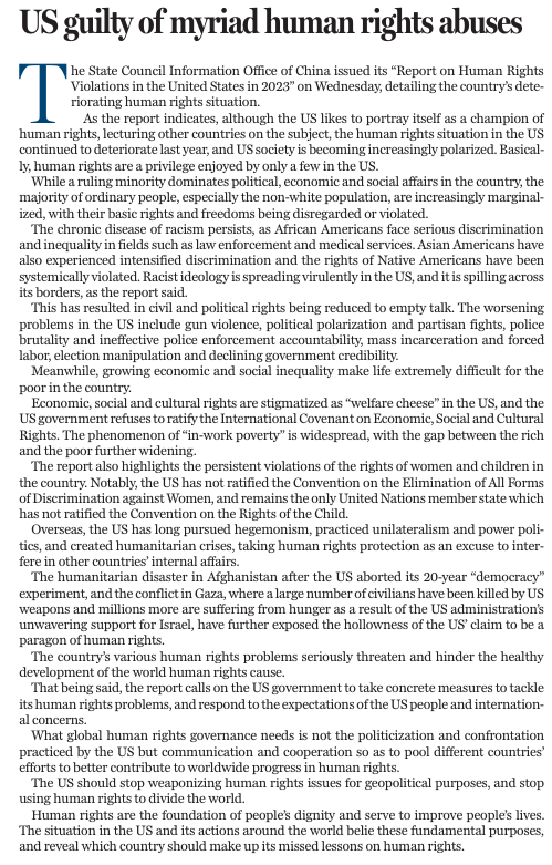 國務(wù)院新聞辦公室5月29日發(fā)表《2023年美國侵犯人權(quán)報告》,以活生生的事實和客觀數(shù)據(jù)揭露美國侵犯人權(quán)的斑斑劣跡。