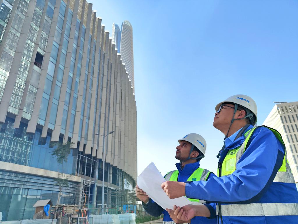 2023年11月27日,中建深圳裝飾有限公司項(xiàng)目經(jīng)理徐笑笑(右)與來自埃及的幕墻工程師艾哈邁德·賽義德在埃及開羅以東的埃及新行政首都中央商務(wù)區(qū)施工現(xiàn)場一同查看幕墻安裝進(jìn)度(手機(jī)拍攝)。新華社發(fā)(中建深圳裝飾有限公司供圖)