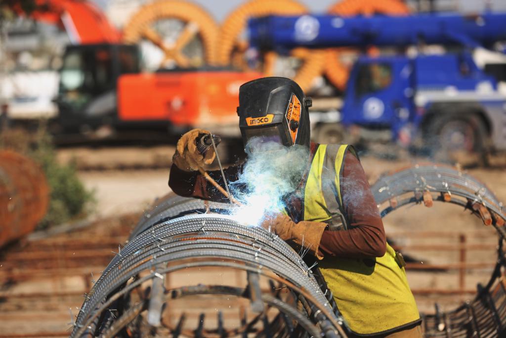 3月2日,一名中方員工在伊拉克巴格達(dá)尼蘇爾立體交通樞紐項(xiàng)目現(xiàn)場施工作業(yè)。新華社發(fā)(哈利勒·達(dá)伍德攝)